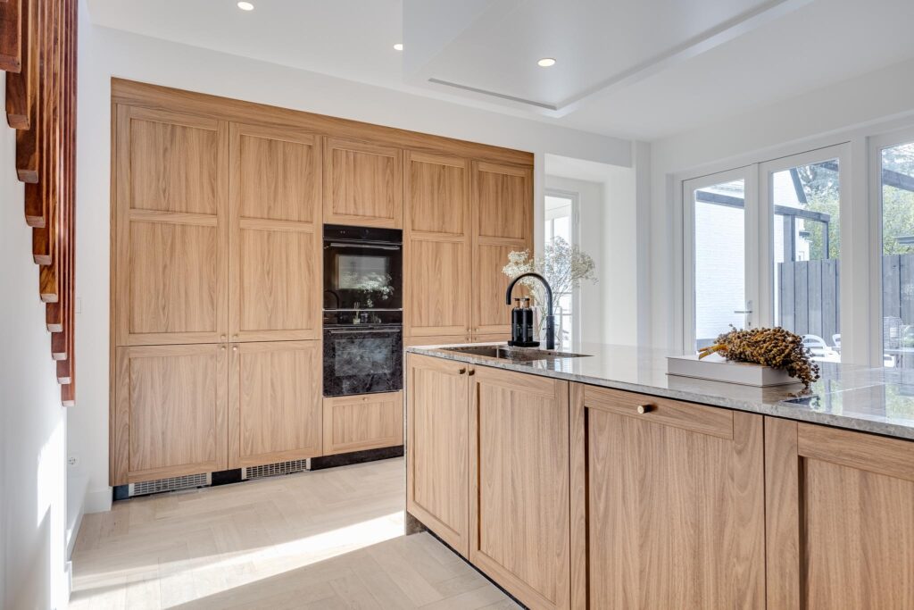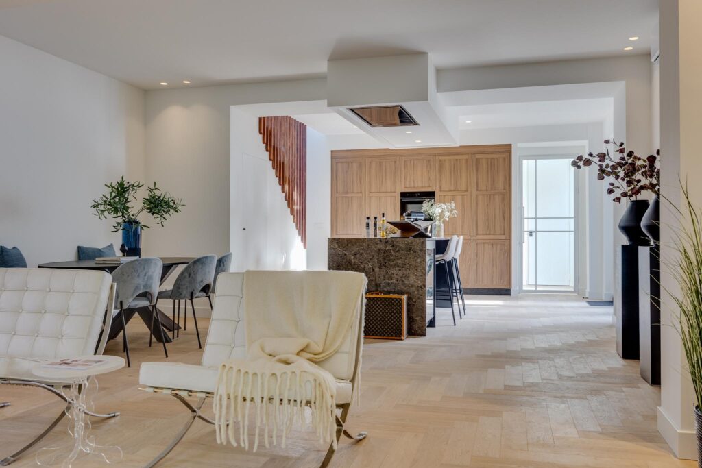entree met toilet en toegang tot de kantoorruimte. De stijlvolle keuken met kookeiland is voorzien van alle hoogwaardige inbouwapparatuur waaronder een 6-pits inductiekookplaat, Quooker, 2 combi- ovens Wifi gestuurd met home connect systeem, vaatwasser, wijnklimaatkast en 2 koel-/vrieskasten. Door de openslaande deuren die grenzen aan de keuken, heeft u altijd zicht op de heerlijke buitenruimte. De ruime eet-/woonkamer grenst aan de prachtige inpandige patio, welke voor veel extra lichtinval zorgt. De volledige begane grond vloer is voorzien van vloerverwarming, airconditioning en een visgraatvloer. Via de trap met trapkast gaat u naar de eerste verdieping.