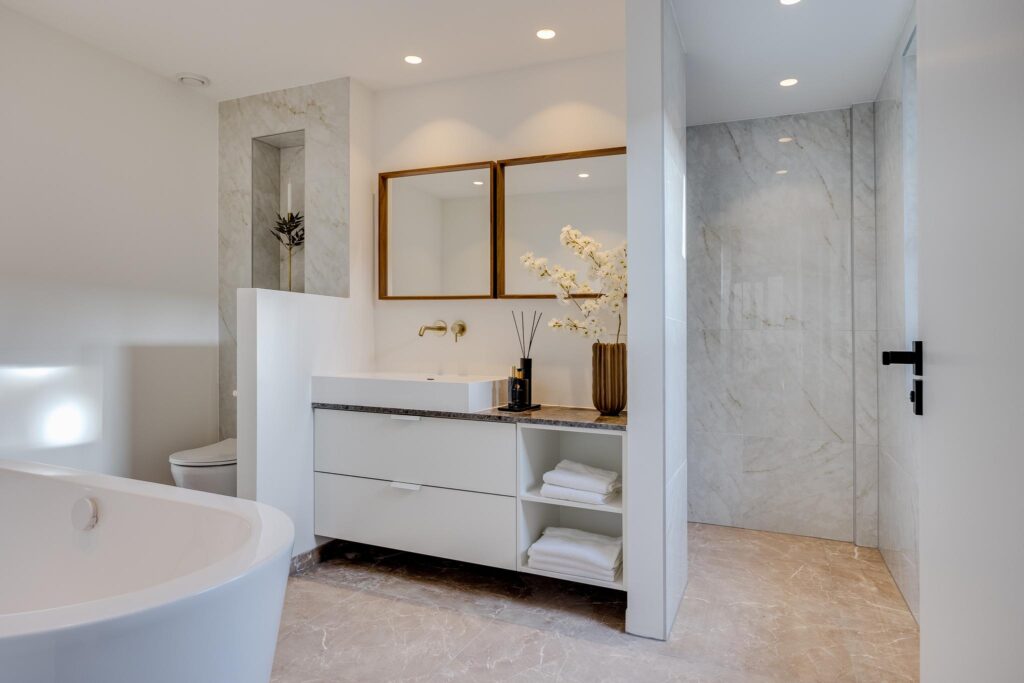 Eerste verdieping: de overloop grenst aan 4 slaapkamers, een wasruimte, badkamer en een apart toilet. Twee slaapkamers beschikken over een luxe badkamer ensuite. Daarbij grenzen deze ook aan de inpandige patio, waarbij de master bedroom een frans balkon bezit. De master bedroom heeft een luxe badkamer met een vrijstaand bad, dubbele wastafel, toilet en inloopdouche. De overige badkamers beschikken over een wastafelmeubel en inloopdouche. De bovenverdieping is tevens voorzien van dakramen welke elektrisch bedienbaar zijn inclusief screens, een intercom met camera en bediening van de voordeur en airconditioning.