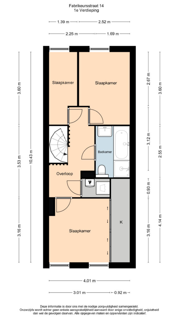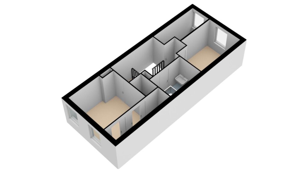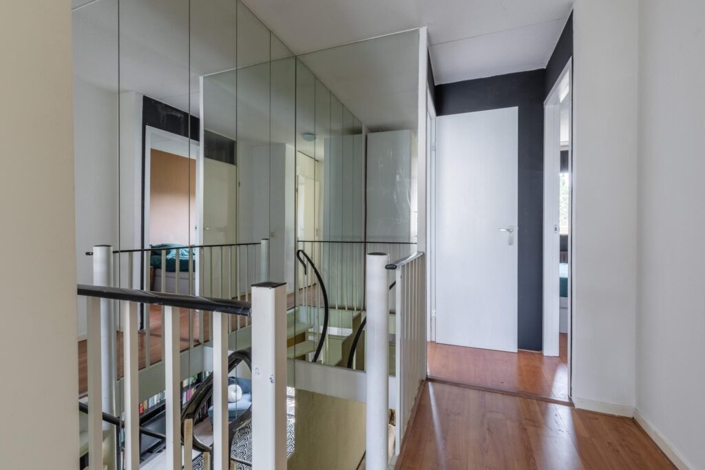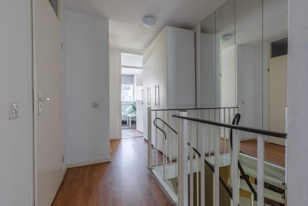 Via trap in woonkamer naar verdieping met overloop, 2 fijne slaapkamers aan de achterzijde en ruime slaapkamer aan de voorzijde v.v. vaste kastenwand met veel opbergmogelijkheden, een complete badkamer met toilet, ligbad, douche en wastafel, bergkast met CV-combiketel en wasmachineaansluiting.