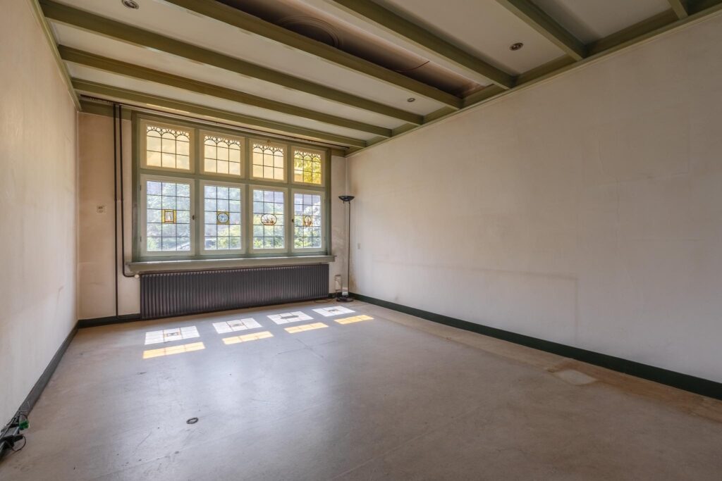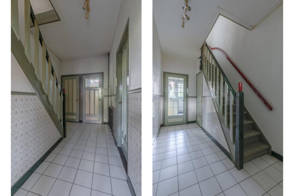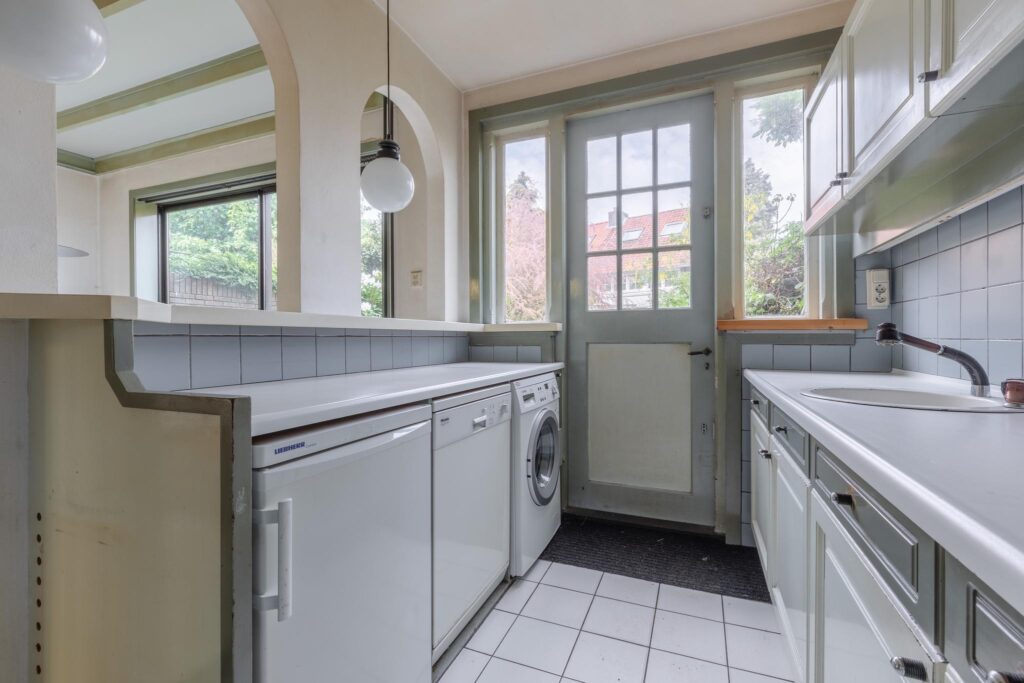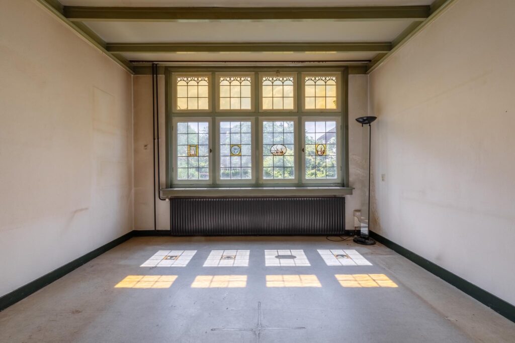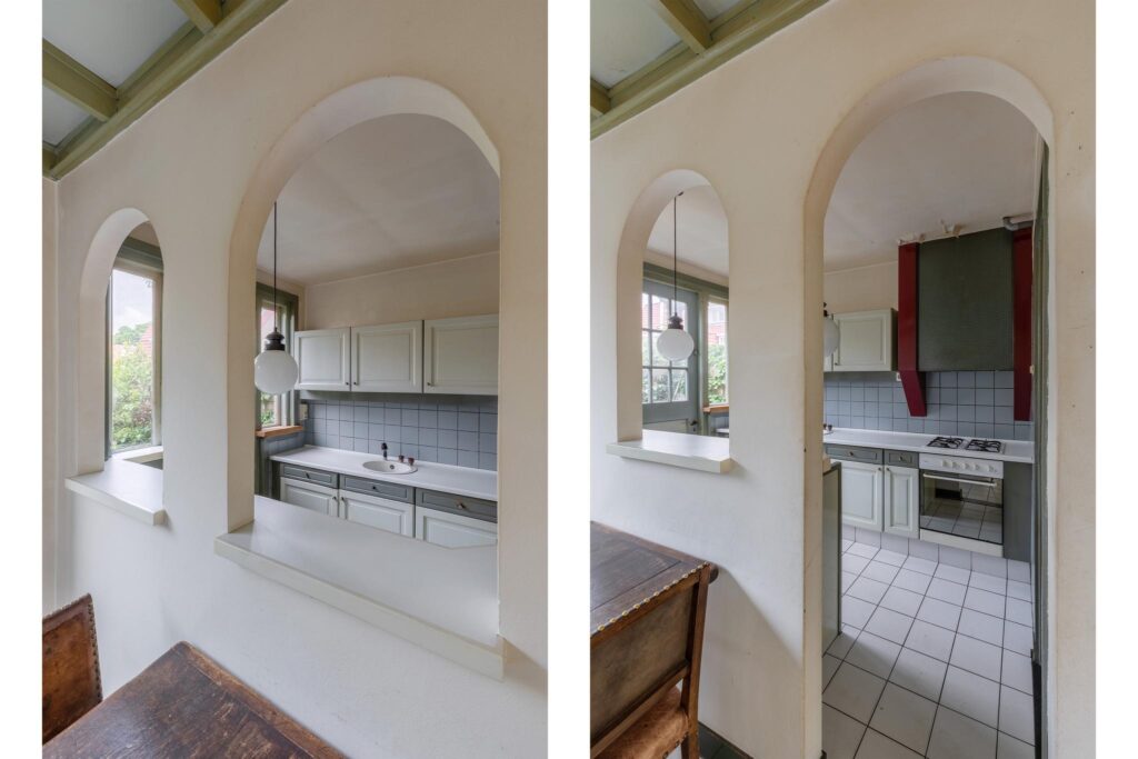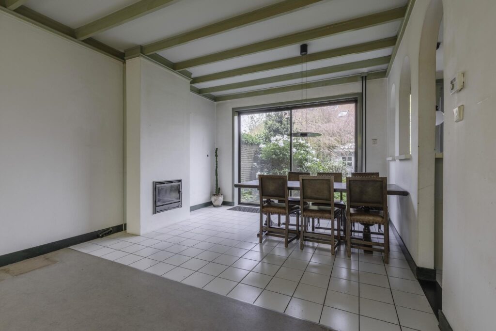 Begane grond: tochtportaal, ruime hal met toilet en fonteintje, trapkast, toegang tot de woon-/eetkamer met prachtige glas-in-lood ramen, hoge plafonds van ca. 2.65m en een schuipui naar de tuin. De open keuken bevindt zich aan de achterzijde tevens toegang tot de tuin.