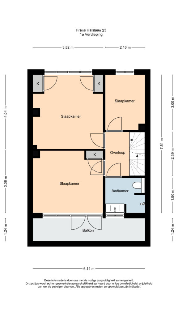 Eerste verdieping: overloop welke toegang geeft tot drie in grootte variërende slaapkamers waarvan de master bedroom met balkon en de badkamer met douche, wastafel en toilet.