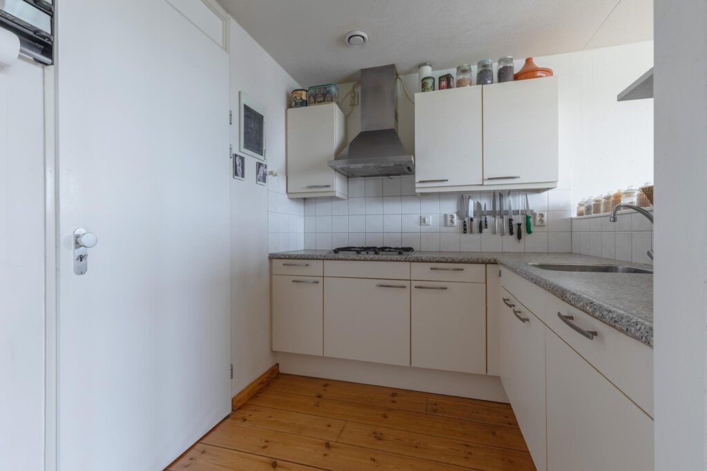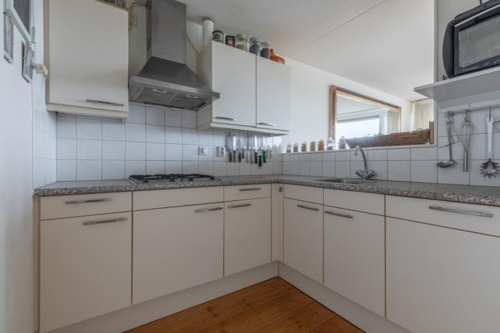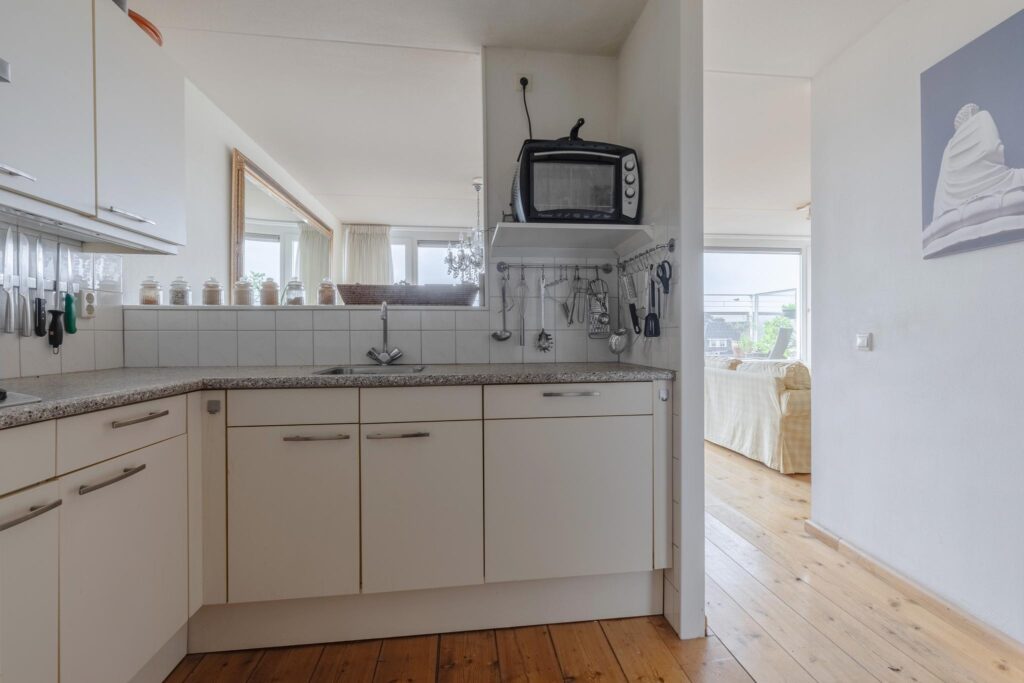 Entree, hal met ruim toilet, ruime en lichte woon-/eetkamer met toegang tot zonnig groot terras (ligging zuid) met mooi uitzicht over het centrum, keuken voorzien van diverse apparatuur, bijkeuken met wasmachine-/drogeraansluiting en de c.v. opstelling.