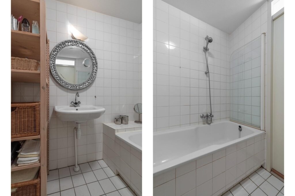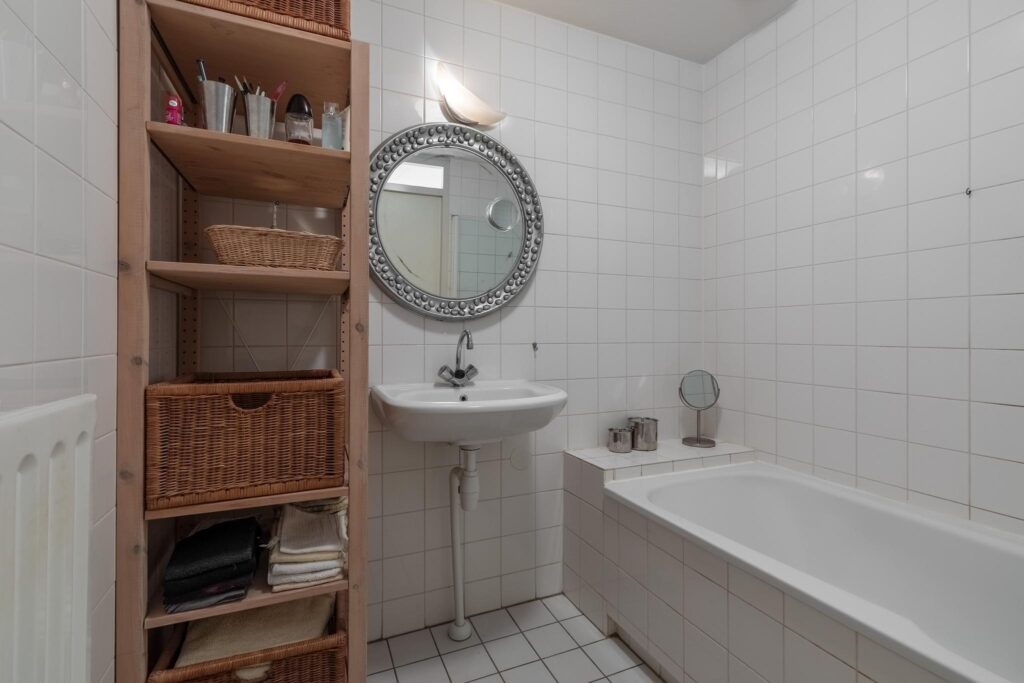 De badkamer is voorzien van een ligbad met douche, wastafel en verwarming.
