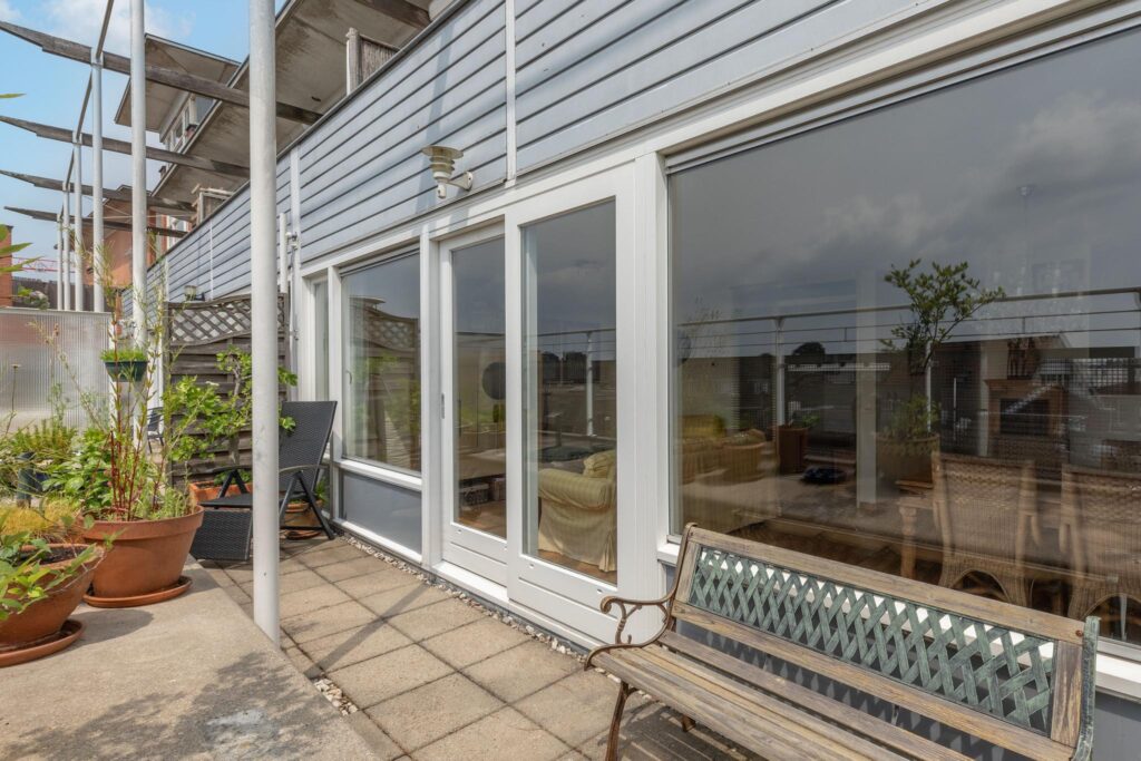 De woonkamer heeft over de breedte van zeven meter ramen inclusief een schuifpui die toegang geeft tot het terras. De woning is daardoor bijzonder licht en biedt door de ligging volop privacy.