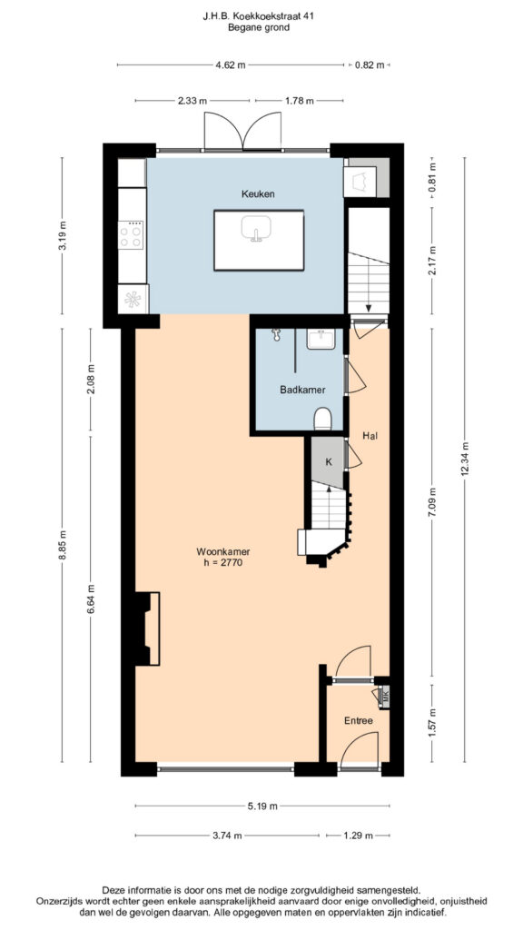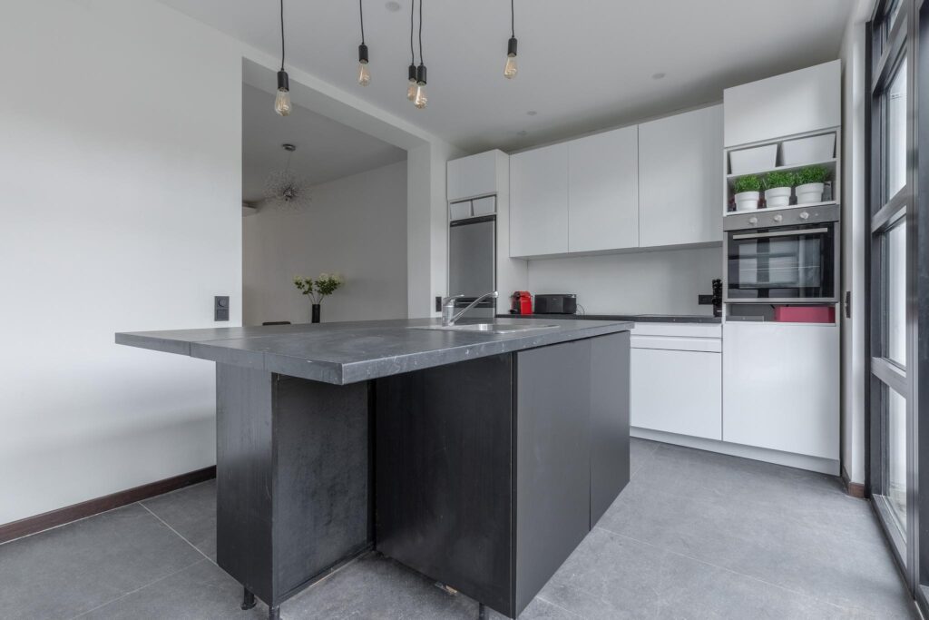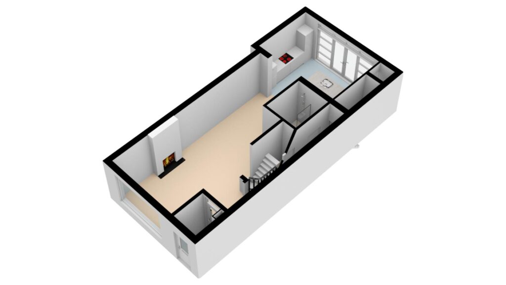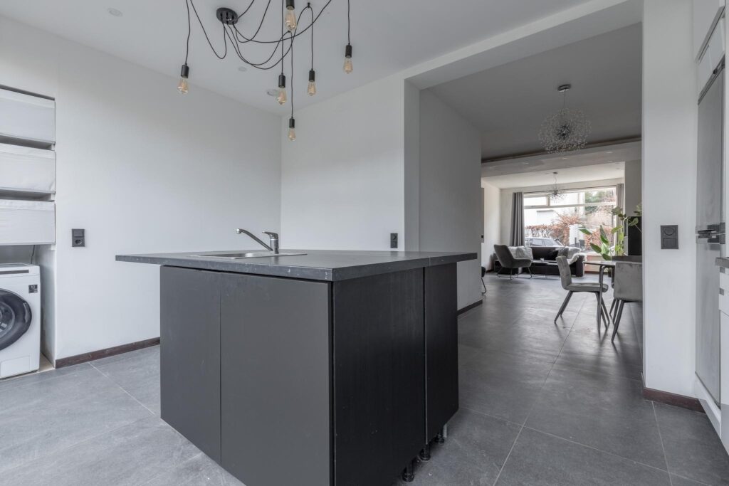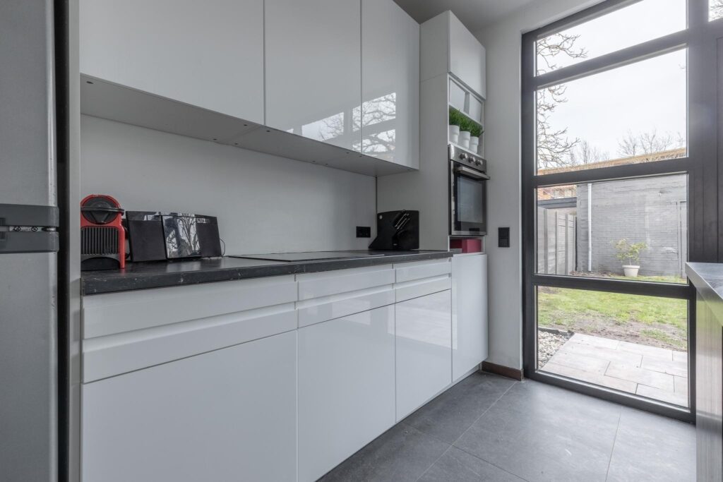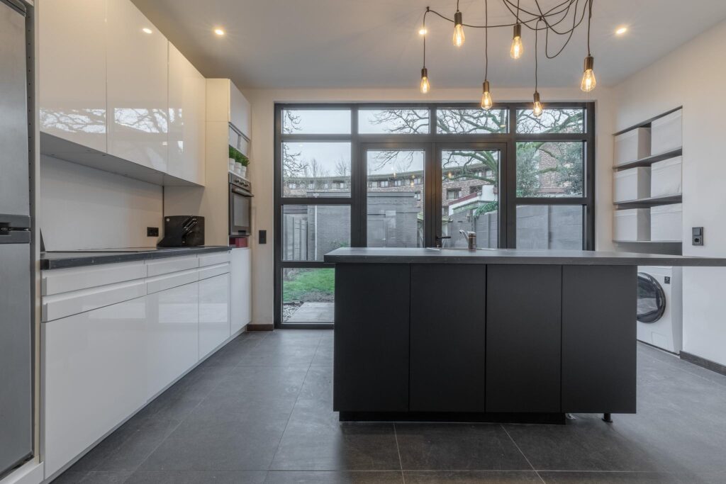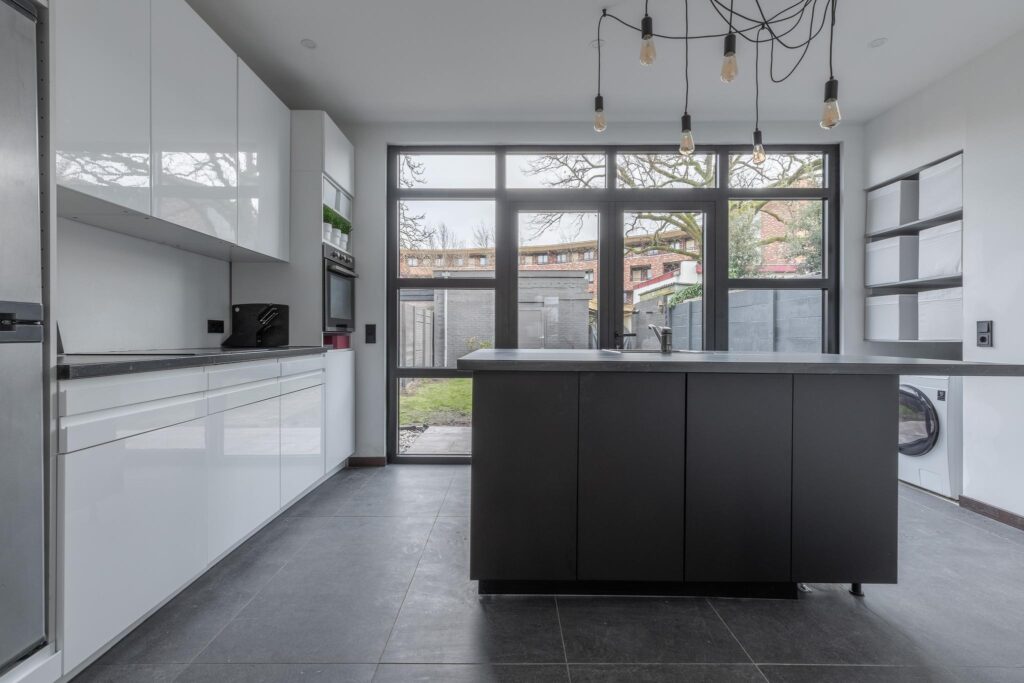 Entree, vestibule, riante woonkamer voorzien van: openhaard, grote zwarte tegels met vloerverwarming en een prachtige open trap van staal. De openkeuken met eiland is voorzien van diverse inbouwapparatuur en tevens de aansluiting voor wasmachine en droger welke praktisch is weggewerkt. Vanuit de keuken bereikt u middels openslaande deuren de zonnige achtertuin.