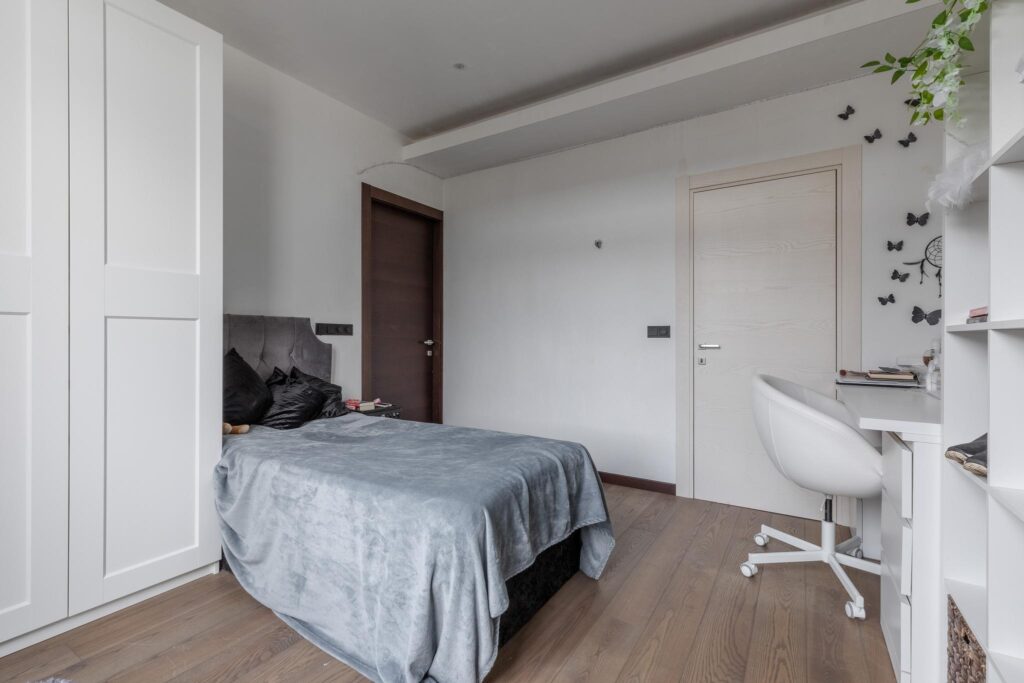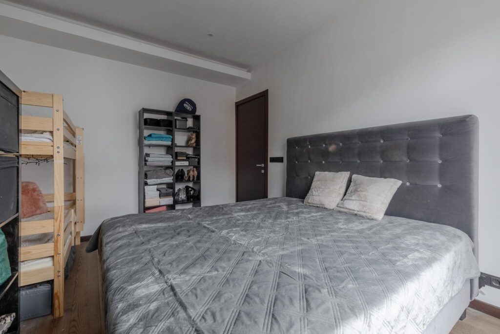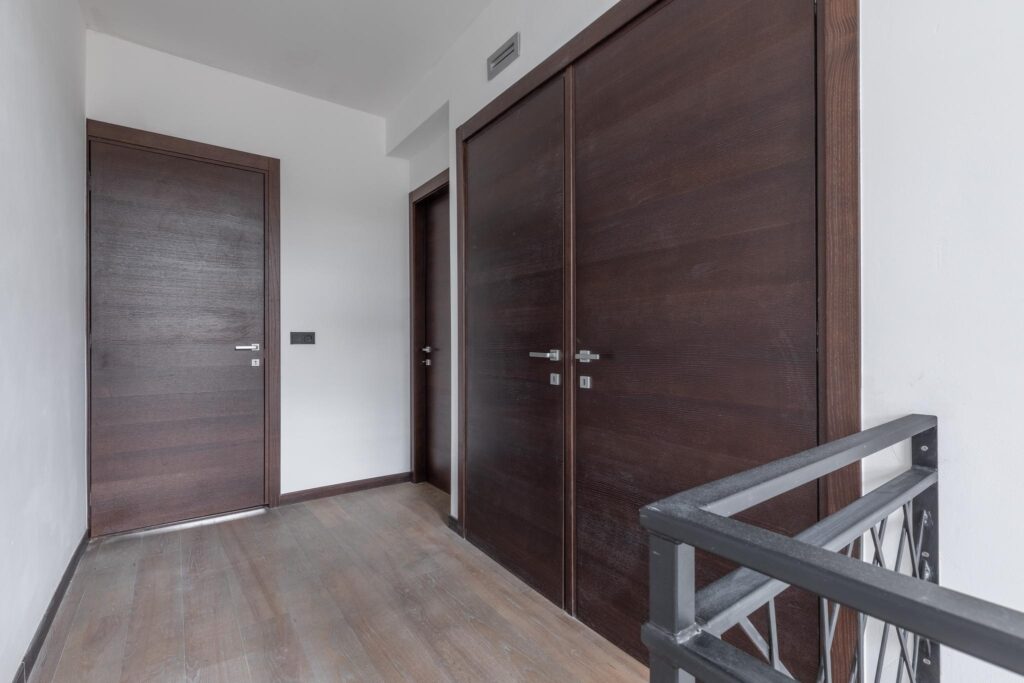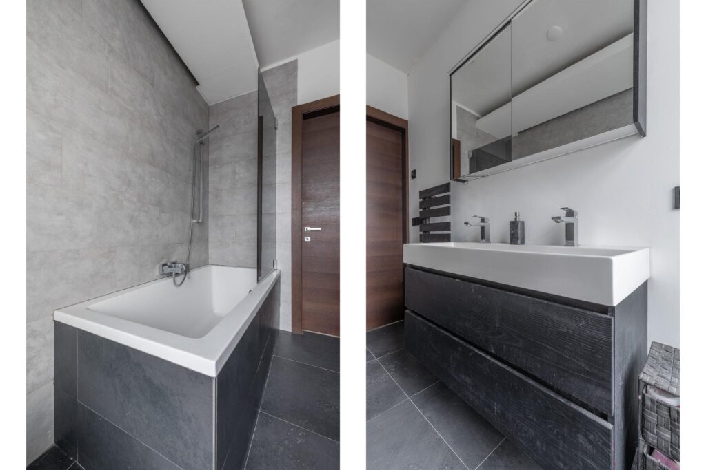Ruime overloop, toegang tot 2 riante slaapkamers waarvan één ideaal geschikt als master bedroom. Moderne badkamer met ligbad/douche, dubbele wastafel met wastafelmeubel en toilet.