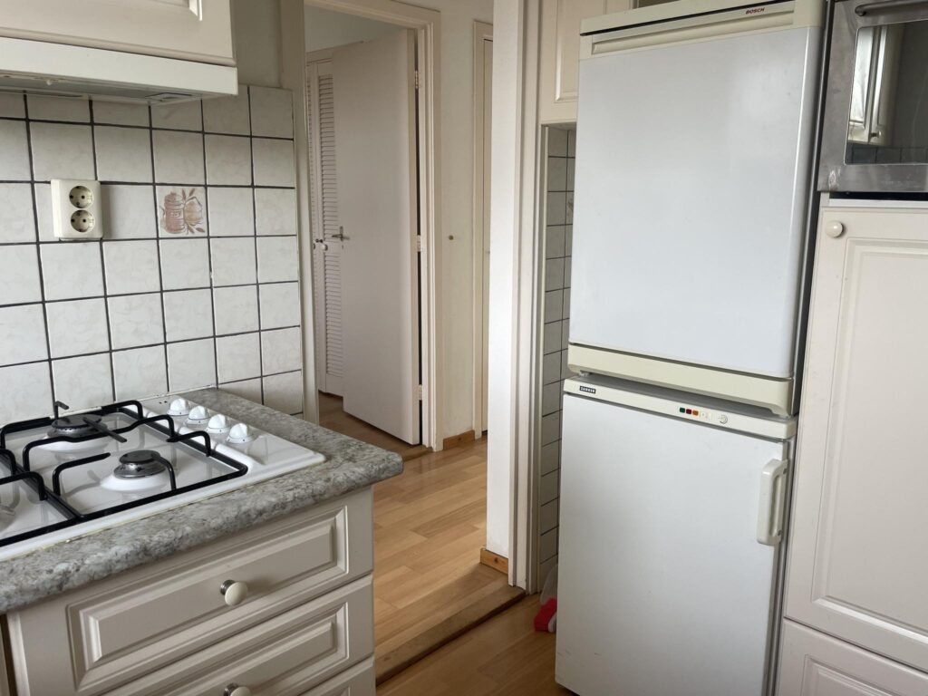 Binnenkomst in hal, gesloten keuken met apparatuur, ruime slaapkamer met vaste kast, separaat toilet, badkamer met douche, wastafelmeubel en aansluiting voor wasmachine en droger, ruime woonkamer met balkon en een tweede slaapkamer met schuifdeur.
