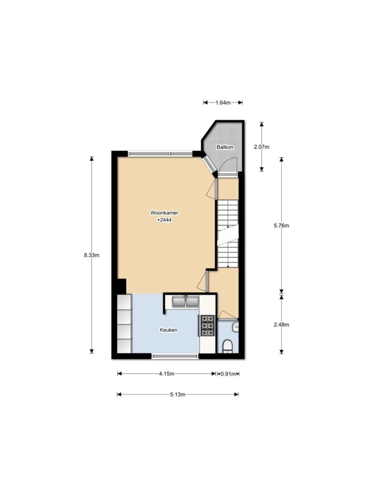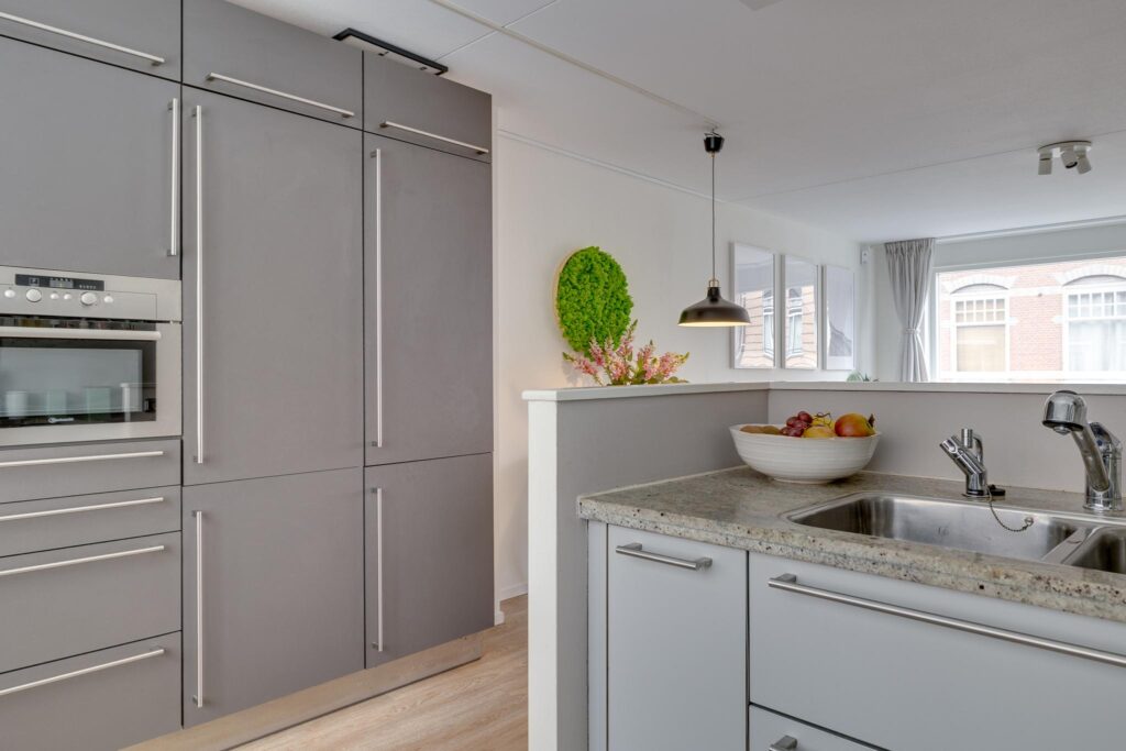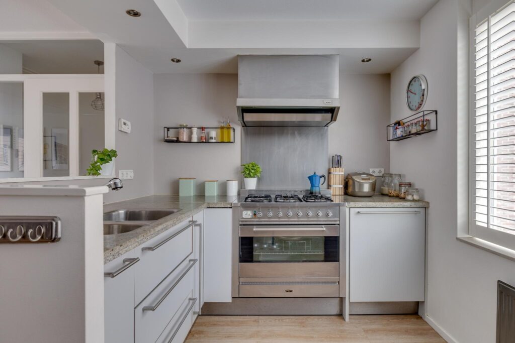 bereikt u de overloop op de 1e verdieping met modern toilet. De woon-/eetkamer heeft een open, fraaie strakke keuken die is uitgerust met een luxe Boretti fornuis v.v. dubbele grilloven en 6-pits gaskookplaat. Voorts vindt u hier een Itho afzuigkap, Bauknecht vaatwasser, combi oven/magnetron en een grote koel-/vriescombinatie. Het werkblad is van natuursteen, heeft een dubbele spoelbak en de vele kasten en lades bieden voldoende bergruimte.
