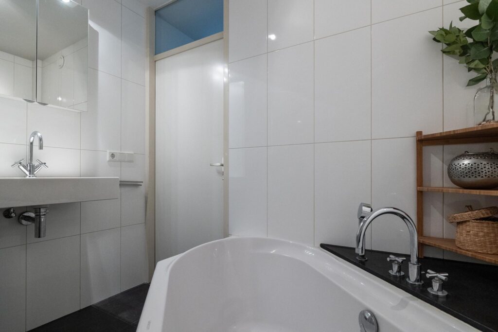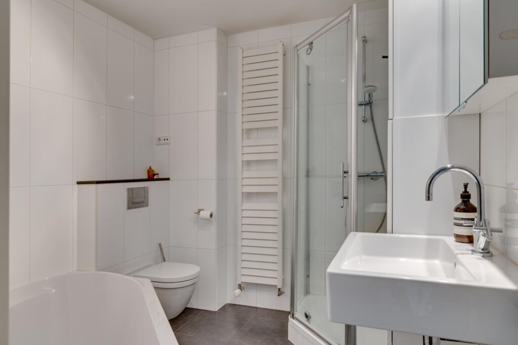 De moderne badkamer is ruim van opzet en is uitgerust met een ligbad, vaste wastafel, 2e toilet, douchecabine en designradiator.