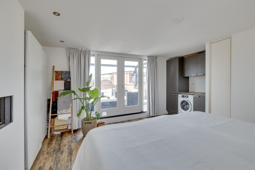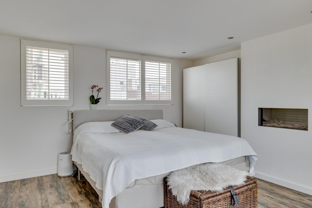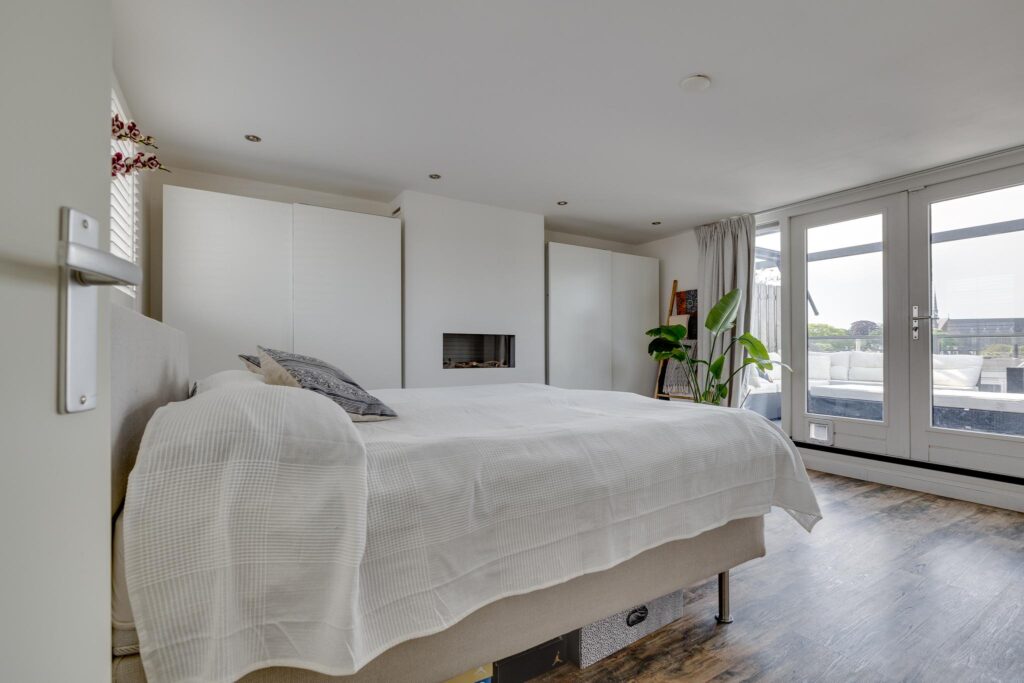 Een laatste vaste trap brengt u naar de 3e verdieping (4e woonlaag). De huidige bewoners hebben hier een unieke master bedroom gerealiseerd welke prachtig is afgewerkt met schouw en inbouwspots.