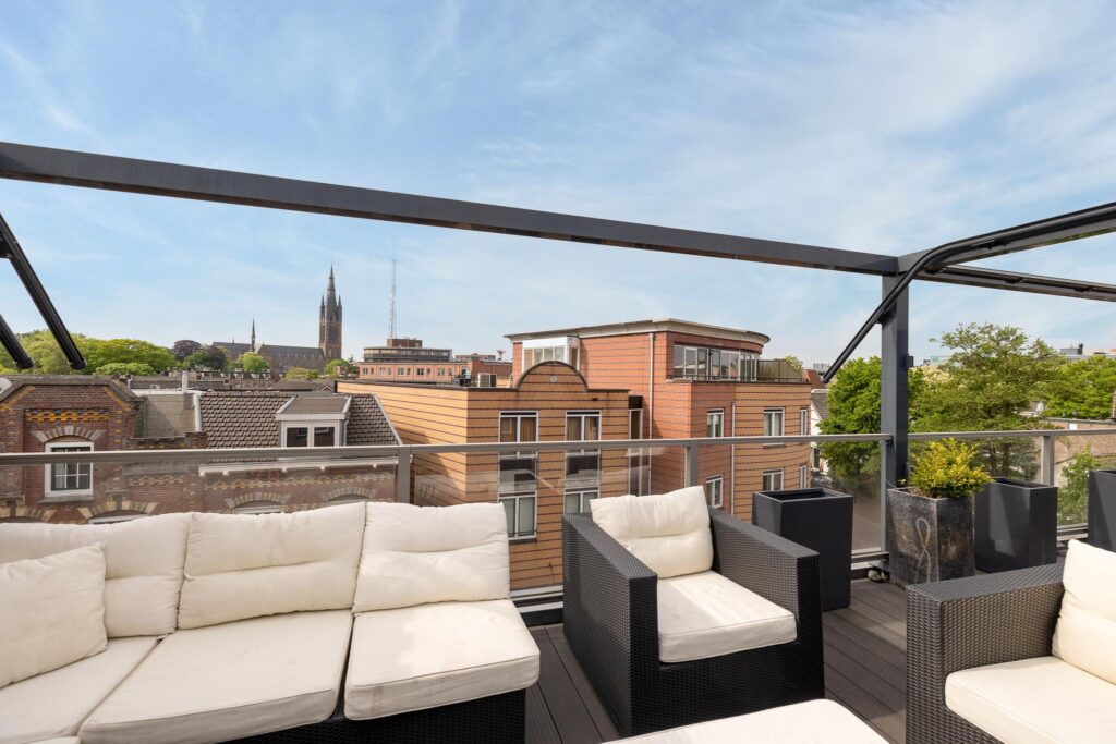 Via de openslaande deuren bereikt u het prachtige dakterras van waar u een fabuleus vrij uitzicht heeft over het centrum van Hilversum en de fraaie gerestaureerde Vitus kerk! Hier kunt u urenlang buiten loungen of eten. Een windscherm en elektrisch zonnescherm, twee heaters en de ingebouwde verlichting maken dit terras helemaal af!!!