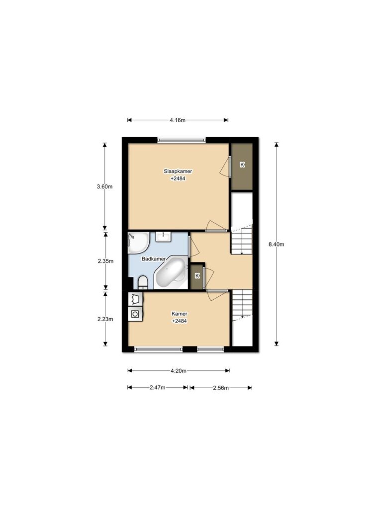 Een vaste trap leidt naar de 2e etage. Aan de royale overloop (met vaste kast) grenzen 2 slaapkamers en een badkamer. De slaapkamer aan de voorzijde is v.v. elektrisch zonnescherm en de slaapkamer aan de achterzijde heeft de mogelijkheid voor het creëren van een wasruimte (nu op bovenst etage).