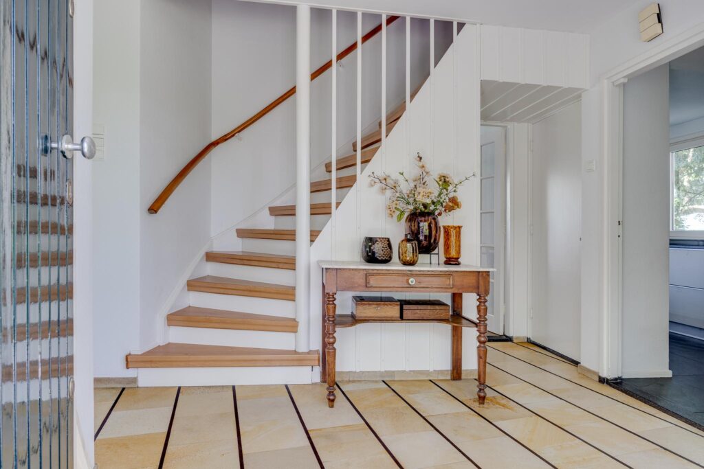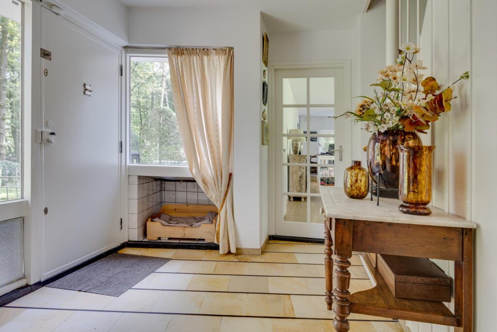 Begane grond: binnenkomst in hal met garderobe, toilet met fonteintje, trap naar souterrain. De vorige eigenaren hebben in de hal het verblijf voor de hond gecreëerd.