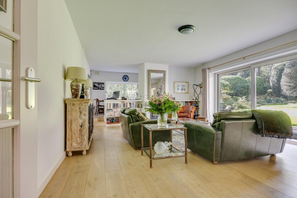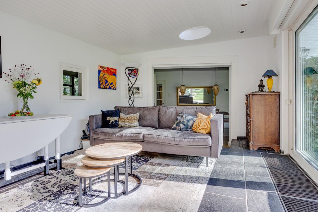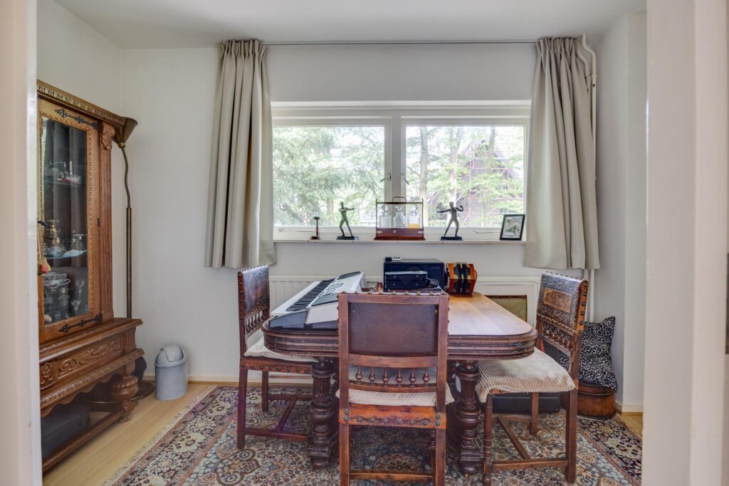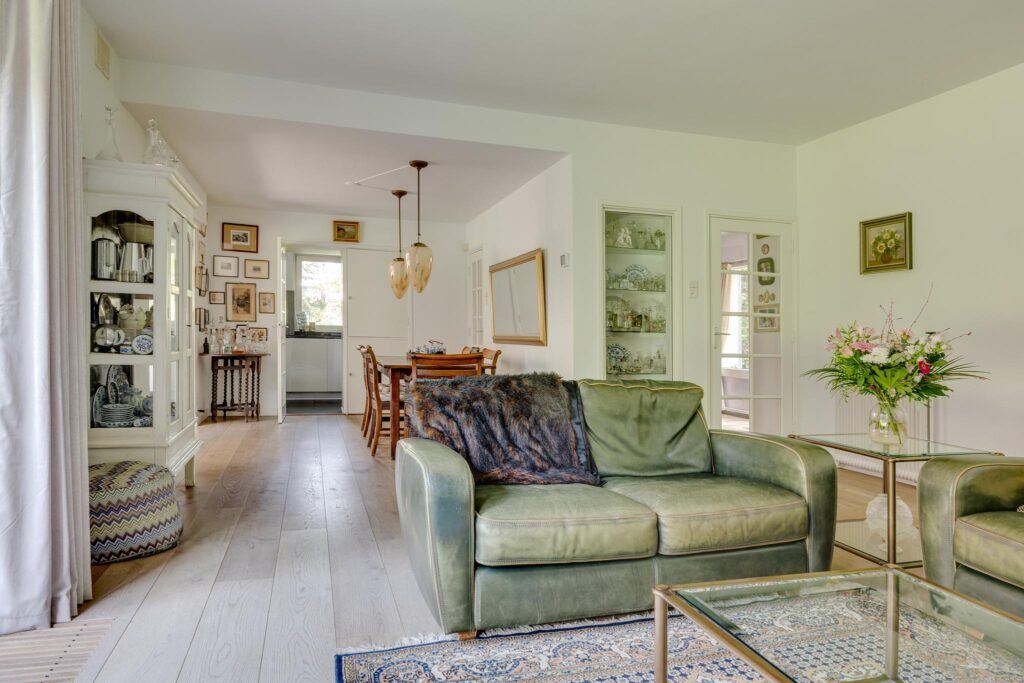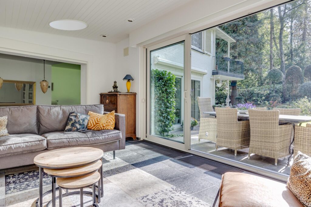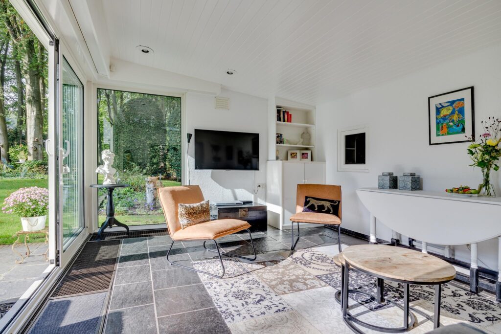Tuingerichte woonkamer met aan de linkerzijde een verhoging waar zich thans het kantoor bevindt. Aan de woonkamer grenst de tuinkamer met tevens prachtig uitzicht over de grote tuin. Zowel de woon-/ als tuinkamer zijn beide v.v. een grote schuifpui met zonwering en geven toegang tot het terras.