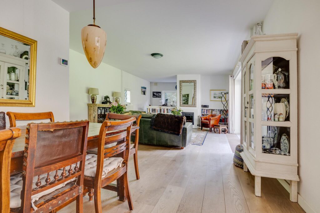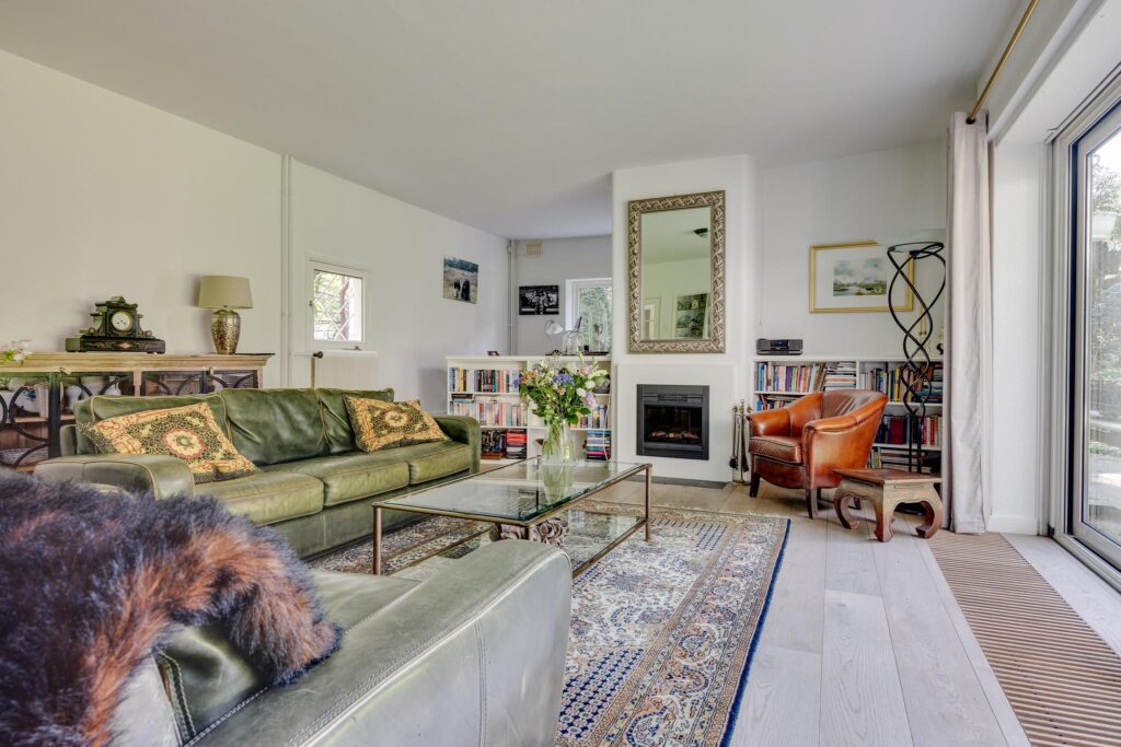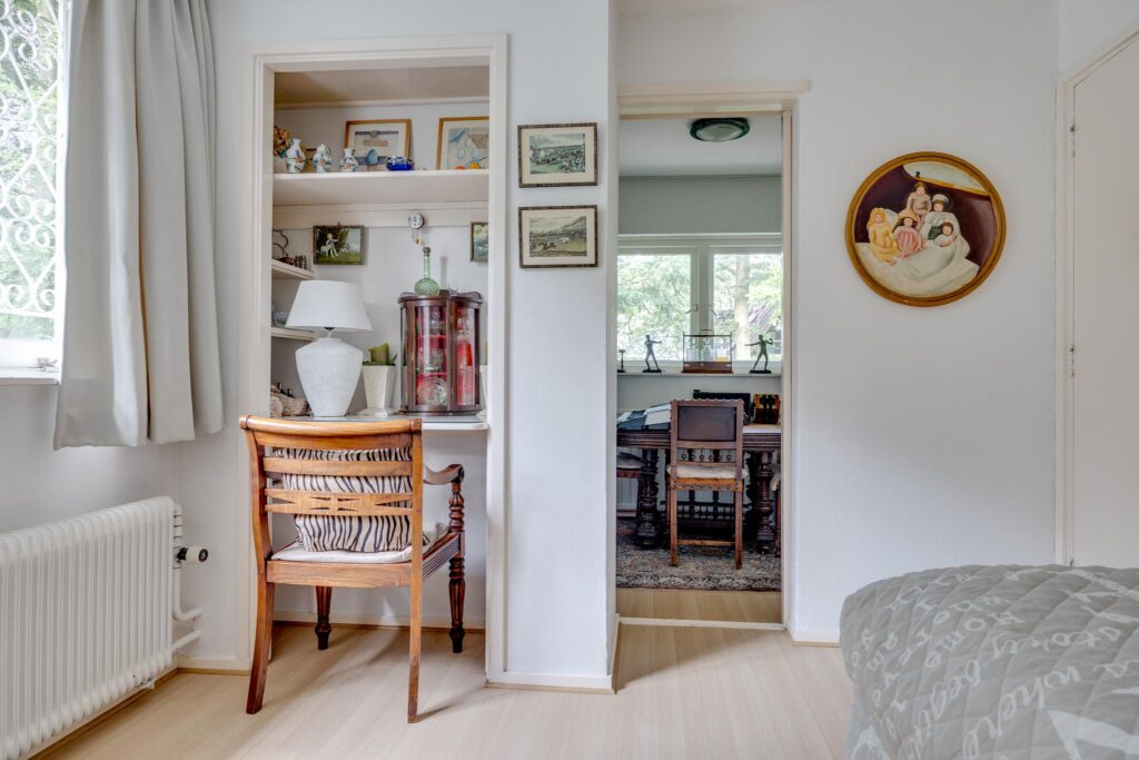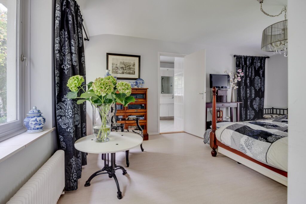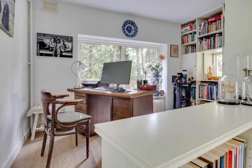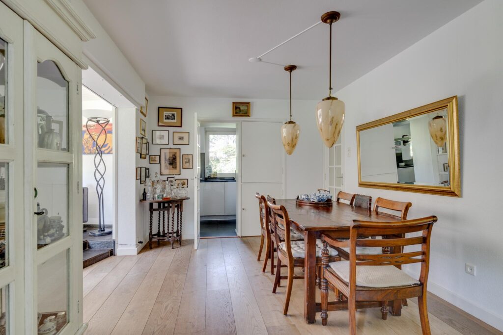 Tuingerichte woonkamer met aan de linkerzijde een verhoging waar zich thans het kantoor bevindt. Aan de woonkamer grenst de tuinkamer met tevens prachtig uitzicht over de grote tuin. Zowel de woon-/ als tuinkamer zijn beide v.v. een grote schuifpui met zonwering en geven toegang tot het terras.