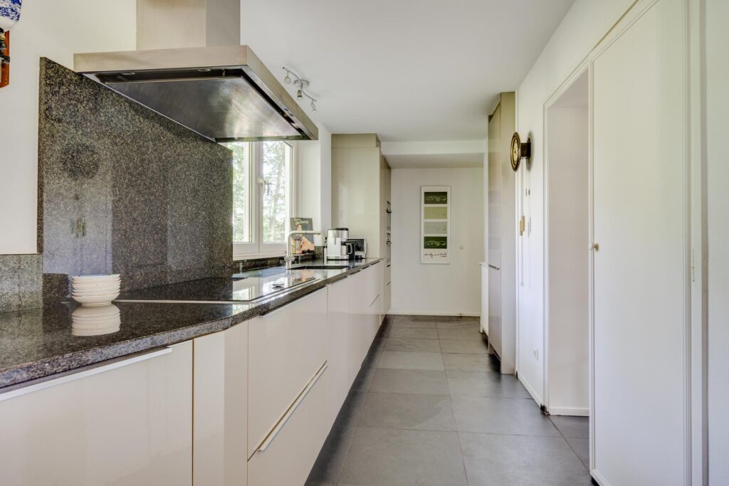 De moderne keuken is voorzien van diverse inbouwapparatuur zoals 5-pits inductiekookplaat, afzuigkap, magnetron, oven, grote koelkast en vriezer.