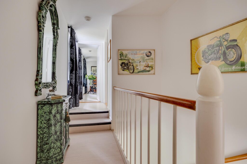 Eerste verdieping: overloop welke toegang geeft tot vier in grootte variërende slaapkamers. De master bedroom is gelegen aan de linkerzijde en v.v. balkon en badkamer en suite met ligbad, toilet, wastafel en douche.
