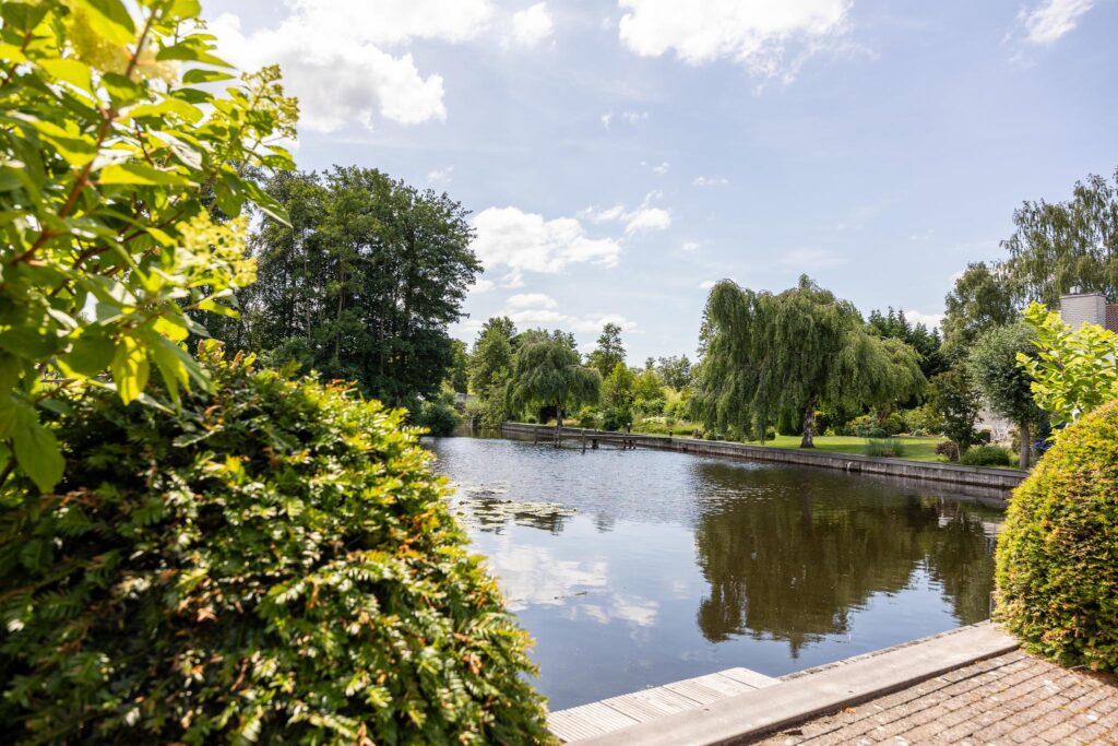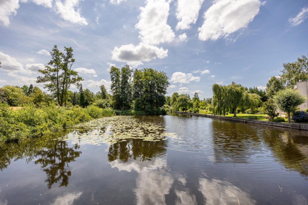 Aan de achterzijde bevindt zich het water met steigers en drijvende botenloods.