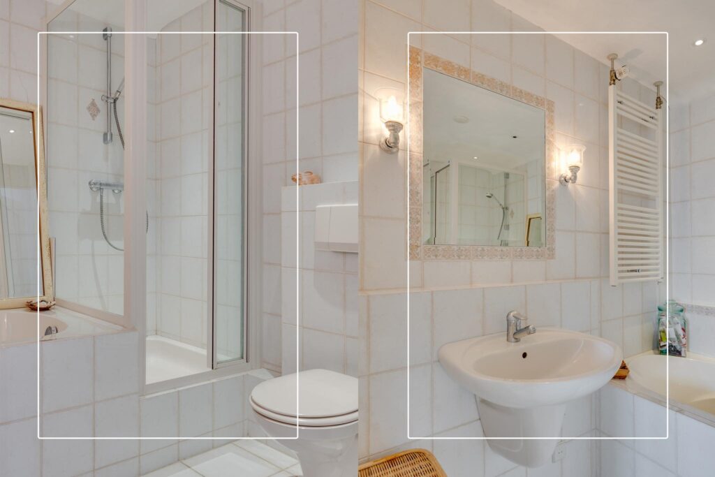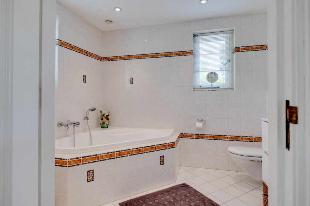 Een tussenliggende badkamer met ligbad, separate douche, wastafel en toilet.